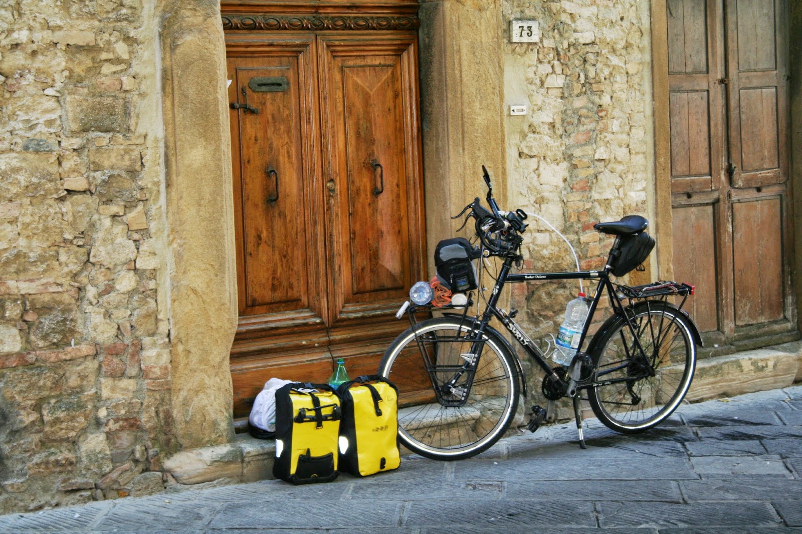 Y ahora, curiosidades varias: esta es la bici de un profesional del cicloturismo. Compartimos parque y fuente con él. Llevaba de todo. Deshizo la maleta de la comida, comió como un campeón (tenía un banco llenito de víveres), lavó la maleta, se puso unas chanclas, etc. Como detalle, fijaros en el tubo que sube desde la botella que lleva en el portabidones ... lo dicho, un crack: